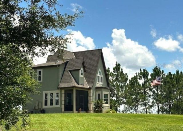 This amazing home located on 5.8 acres overlooking an expanse of waters and nature including daily sunrises peeking over the horizon. PERFECT LOCATION FOR YOUR SMALL BUSINESS, park all your vehicles, work on your equipment as there is a 14' center garage door AND 2 offices or workshops UNDER AIR. This incredible 41'x41' Carolina Barn and home are behind a motorized gate, and fenced. Need a place for gardens, greenhouses (but 3 minutes from a Publix shopping center), bring your horses and animals! The luxury chicken coop complete w/24 hens and 2 roosters and can be the start of your farm, or use this property as a home based business. Keep your equipment, large trucks and RV here! When the gate opens and leads you onto this gorgeous property, lined with huge oaks, fruit trees, bamboo for privacy, crepe myrtles, native Florida plants and other shrubs, the peaceful invitation is apparent. At the top of the hill is this gorgeous home w/incredible pitched roof lines which creates a beautiful silhouette against the blue skies, but also creates amazing architecture inside. The cathedral ceilings in the living room allow the huge (NEW) windows let in the gorgeous rays from the sunrises and enables the views out overlooking the birds in the water, the fish jumping, an occasional otter swimming by, and the incredible birds swooping around the home, and third generation sandhill cranes roosting and raising their babies. The primary suite has the highest level view out both the front and rear of the home, the bathroom was remodeled w/beautiful tile walls and stone floor in the shower. The family room on the lowest level is still at a high level looking out the back, has plenty of room for your home office area with closet storage, and the laundry space has tons of extra storage. Out onto the sunroom, you have a massive porch area - perfect for entertaining and relaxing. From your side screened porch off the living room, your front screened porch or your sun room, you can bring the outside in. From the inside, there isn't a room without a view, perfection. The workshops are second to none. Concrete slab and steel construction, the center aisle has plenty of space for vehicles, boats, RV, work equipment and tons of storage w/the lofts on both sides. The dual workshops are under AC, so these can be utilized as offices, art studios, school rooms, or other creative ventures. There is additional covered workshop and carport areas off the back of the building, also on concrete for parking/projects. The wellhouse was built with storage in mind, no need to clutter your workshop w/lawn tools, they all fit here. Located on a paved, dead end road, you can live as privately as you would like. Knowing that the home has been updated and extremely well maintained, the decision to live on acreage, wi/all the conveniences of city living within minutes is a simple one. The option of having your business run from your home is attractive with the distance of the home from the workshops will maintain that privacy. Your dream garden, sunrise or afternoon fishing from the bass filled waters, bird watching, your mini farm, your home based business (or lease out the space you don't need), your Airbnb investment, an idea undiscovered, it is all here for you. Bring your cameras, paints and easel or writer's desk. Inspiration is everywhere here, just waiting for you to discover. Incredibly underpriced now, please see the interior/drone video and make your appointment today!