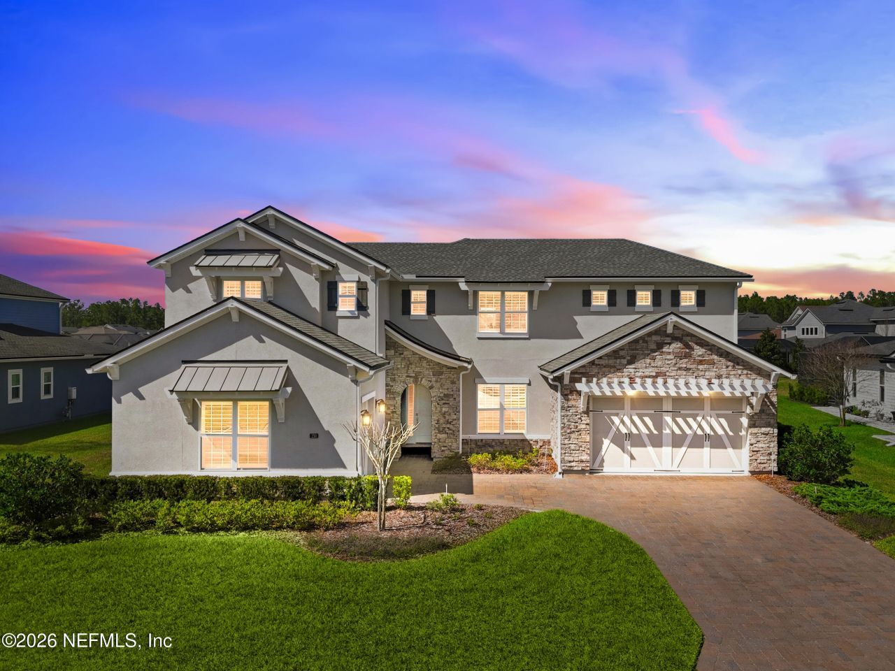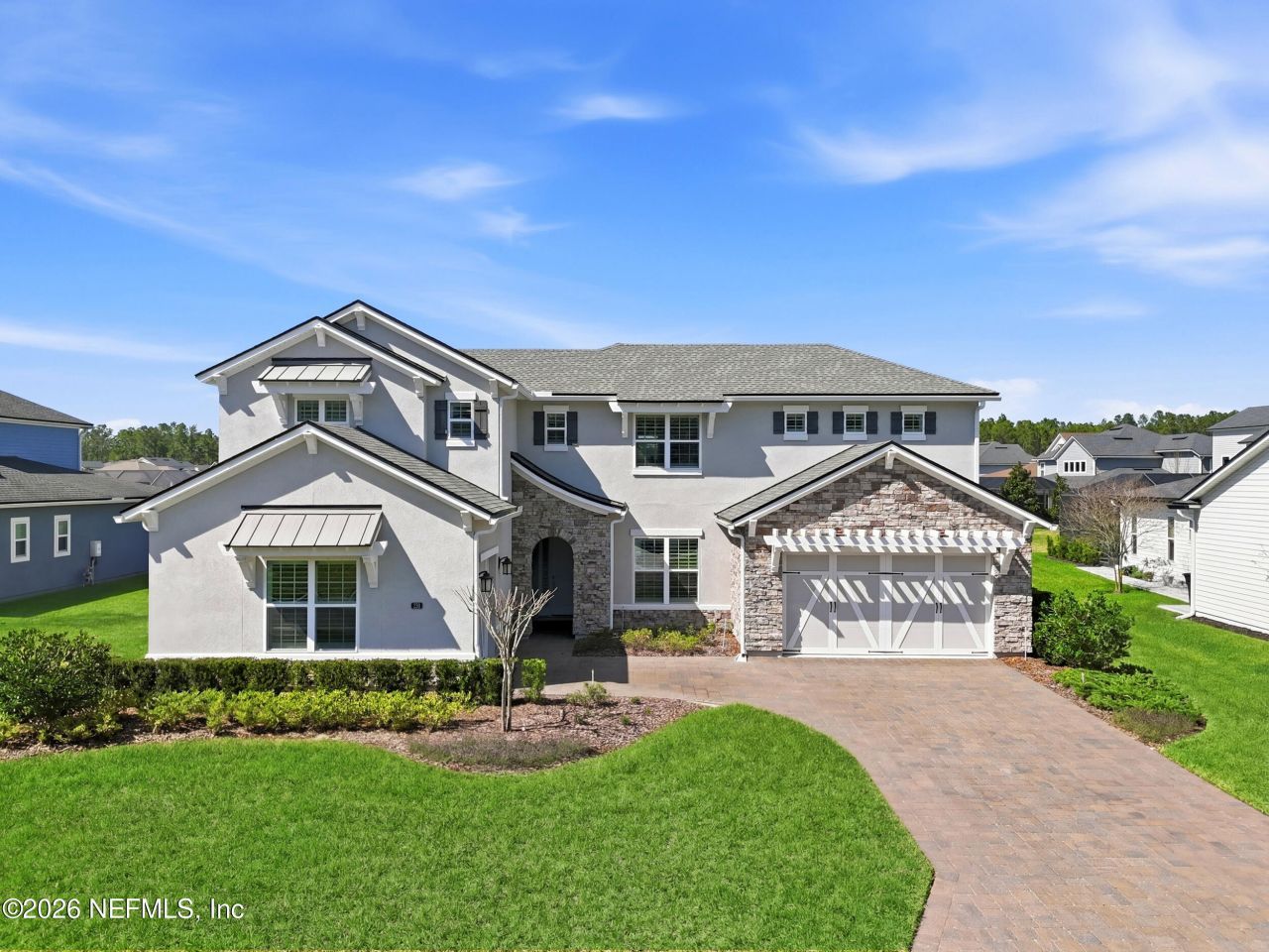 Welcome to one of St. Johns County's most captivating residences, nestled in the highly sought-after Julington Lakes community, where upscale living meets everyday family comfort in the most delightful way. This stunning four-bedroom, four-and-a-half-bathroom home is dressed head to toe in Restoration Hardware finishes, offering a sophistication that whispers rather than shouts. The main floor delivers a thoughtfully designed layout featuring a gorgeous primary suite, a handsome office with double French doors, and a guest suite. Upstairs, two ensuite bedrooms and a spacious bonus loft provide the perfect retreat for growing families or visiting guests. The kitchen is a showstopper, boasting a massive waterfall island, high-end appliances, and custom trim work throughout. Step outside and prepare to be enchanted. The outdoor living space rivals an English garden, complete with a saltwater pool, hot tub, lush turf, and elegant pavers. A summer kitchen equipped with a green egg, built-in grill, and seating bar makes entertaining effortless. Add the covered lanai with electronic shades and a cozy fire pit, and you have a fully fenced backyard paradise designed for making memories. Golf enthusiasts will appreciate the simulator tucked inside the third-car garage, while the golf cart-friendly community keeps things refreshingly pedestrian-oriented. This prestigious, gated natural gas community -- built entirely by Toll Brothers -- features kayak launches, a fitness center, playgrounds, and a resort-style pool. Top-rated schools like Creekside High School sit just minutes away, alongside excellent shopping, dining, and healthcare. This home was crafted for families who love to live beautifully -- and entertain even better. Schedule your private tour today.