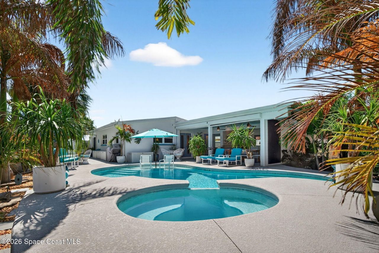 Rare opportunity to own a move-in ready home & embrace a coastal living lifestyle. Fall In Love with this tastefully renovated & captivating Tropical Oasis, steps to the beach. Enjoy living in this tranquil paradise & private single-family pool & spa residence. Vintage style accents to respect the age & character of this home blended with all the modern conveniences & upgrades you would want. A beautiful kitchen, stainless steel appliances, lovely cabinetry & open to first living/dining room. Your sparkling pool & spa are off the trussed tropical indoor/outdoor climate control sunroom with summer kitchen, decorative/functioning fireplace, lounging living room & dining area, a fully rated electric hurricane screen, an inverter heater/ac cooling system will make this the center of your living year-round. Enjoy mature trees, ocean breezes & rocket launches from your back yard. Ample Parking for 4 cars & a separate office/4th bedroom/laundry room.