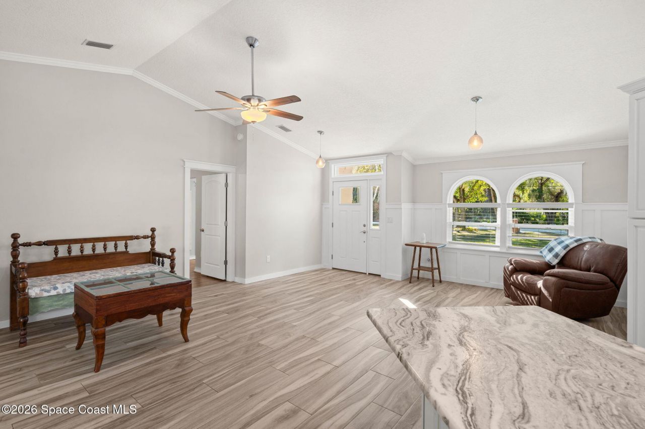 72 Hr KOC. Completely renovated and set on a full acre, this 3-bedroom, 2-bath Cocoa home offers 1,574 sq ft of bright, open-concept living with tile and LVP flooring throughout. Vaulted ceilings, impact windows and doors, and beautifully trimmed interior casings add a polished finish throughout. The spacious kitchen features stainless steel appliances, leathered granite countertops, generous prep space, and a large island perfect for gathering. The primary suite includes patio access and an updated ensuite with an extended vanity and glass-enclosed shower. Enjoy a sprawling screened patio overlooking an expansive backyard with room for a pool, firepit, detached storage structure, and even a pineapple patch. Quiet dead-end street with no HOA. Roof 2017, AC 2016, HWH 2026.