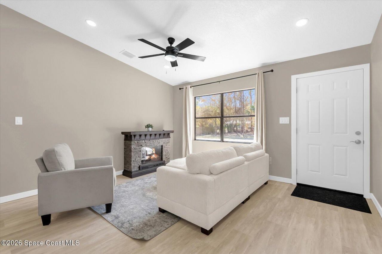 Discover the perfect blend of modern comfort and country freedom in this beautifully remodeled 3-bedroom, 2-bath 1345 sq ft home on a full acre. 22 ft x24 ft accessory building built to suit for new owner prior to closing!Fresh, contemporary interior featuring new granite countertops, brand-new appliances, 42 inch upper cabinets & updated finishes throughout. Enjoy peace of mind with a new A/C system & new ductwork and a roof replaced in 2018.Outside, the expansive one-acre lot offers endless possibilities. Horses and farm animals are allowed, making this property perfect for those seeking a small homestead, hobby farm, or simply room to breathe and grow. With no HOA, youll enjoy the freedom to truly make this property your own. 20 miles from Cocoa Beach and 21 miles from Kennedy Space Center, Blue Origin & SpaceX. Come see today!