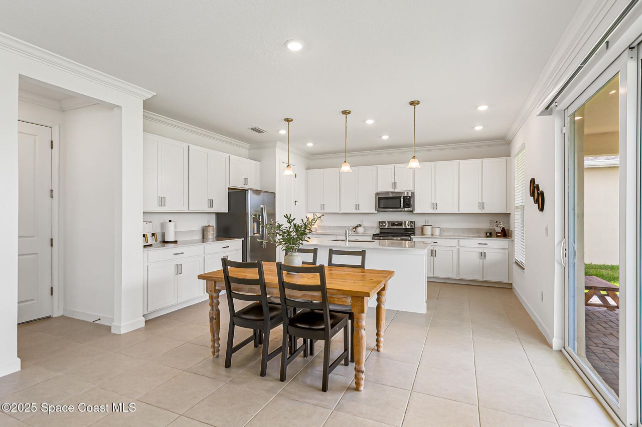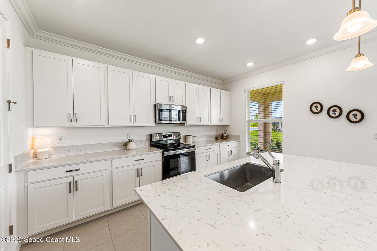 FIVE BEDROOM HOUSE! Stunning Turnkey home w/ 2.5 bath boasting a FIRST FLOOR BEDROOM w/ large walk-in closet, and upstairs Bonus/Flex room. Light & Bright, Classic Timeless White Modern kitchen with 42 cabinets, quartz counters, stainless steel appliances, and a breakfast bar island. Perfect for entertaining. Light floors (Tile is lighter than in photos-a white grey tone). Two story block construction & Impact windows offer peace of mind. Plenty of room for a pool! Enjoy the balcony off the bonus room for a view of rocket launches and star gazing. Owners suite-quartz double vanity in bath, walk in closet, and lake views. Sip coffee on the porch overlooking the backyard & serene lake views. Upgrades include crown molding, stylish ceiling fans, epoxy garage floor w/ flakes and large closet in downstairs room. Pavers driveway. Gated-pool & cabana. NO HOA DUES FOR 6 MTHS. *HOA includes lawn care PLUS regularly planned family activities-egg hunts, movie nights, & seasonal activities Both Bathrooms upstairs have quartz double vanities. Survey available - saving the next buyer money.