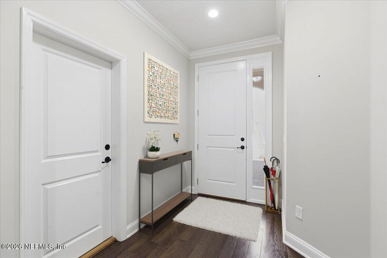 Welcome to this warm and inviting ground-level luxury carriage home offering maintenance-free living in the gated community of Coastal Oaks at Nocatee, one of the nation's most sought-after lifestyle communities. This beautifully designed residence features 2 bedrooms, 2 bathrooms, a dedicated office, and a well-appointed laundry room with built-in cabinetry and sink, combining comfort, style, and effortless living. Inside, you'll find engineered hardwood flooring throughout the main living areas and a thoughtfully designed kitchen with custom wood cabinetry, soft-close pull-out drawers, and a large island that creates a warm yet elegant gathering space. The kitchen is equipped with KitchenAid stainless steel appliances and generous workspace, making it perfect for everyday living and entertaining. The spa-inspired bathrooms feature upgraded cabinetry with abundant storage. The owner's suite includes a large walk-in closet with built-in shelving and seating area, designed for both comfort and organization. Designer tilework and high-end finishes complete the luxurious feel throughout the home. The attached two-car garage includes epoxy flooring and a water purification system, adding both functionality and Comfort. Step outside and enjoy everything Coastal Oaks has to offer. Walk to the fitness center, host gatherings at the private clubhouse, or explore the community by golf cart through Nocatee's scenic greenway trails. Residents also enjoy access to Nocatee's world-class amenities, including kayak launches, miles of nature trails, zip lines, dog parks, and the famous Splash Water Park with its lazy river. Ideally located just minutes from TPC Sawgrass, pristine Ponte Vedra beaches, and historic St. Augustine, this home truly offers the best of Northeast Florida's resort-style living.