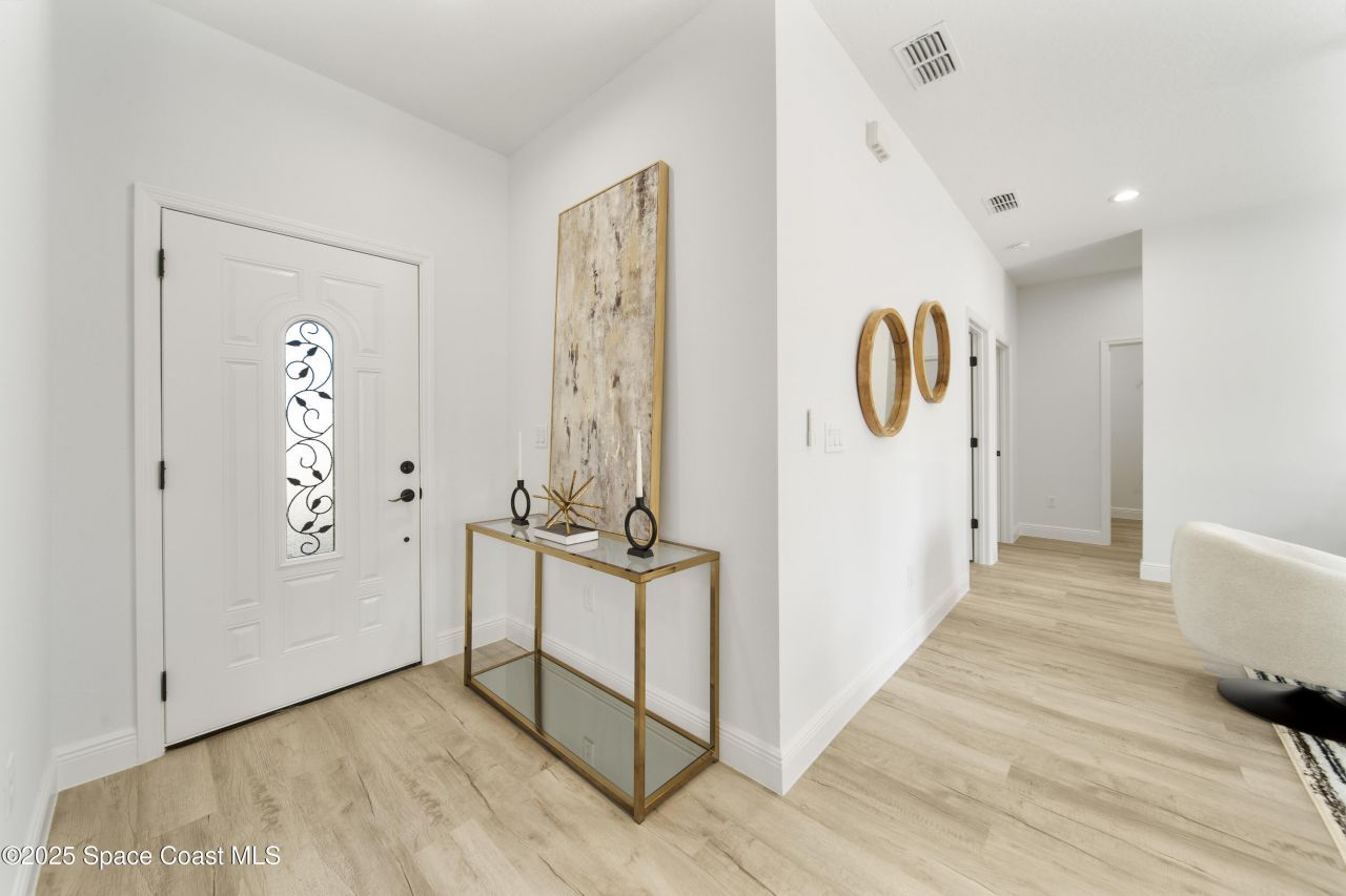 Your Dream Home Awaits! Welcome to this beautifully designed brand-new home in the heart of Palm Bay, where modern aesthetics meet sturdy craftsmanship. Built with block construction, coated in durable stucco, and supported by a solid slab foundation, this home is built to stand the test of time. Step Inside: As you enter, youre greeted by a sunny and spacious open layout designed for both comfort and style. The home features a dedicated living area, a separate dining space, and a large kitchen - all bathed in natural light. Gourmet Kitchen Features: Elegant light shaker cabinets with soft-close technology, Stunning quartz countertops High-quality stainless steel appliances, a spacious walk-in
